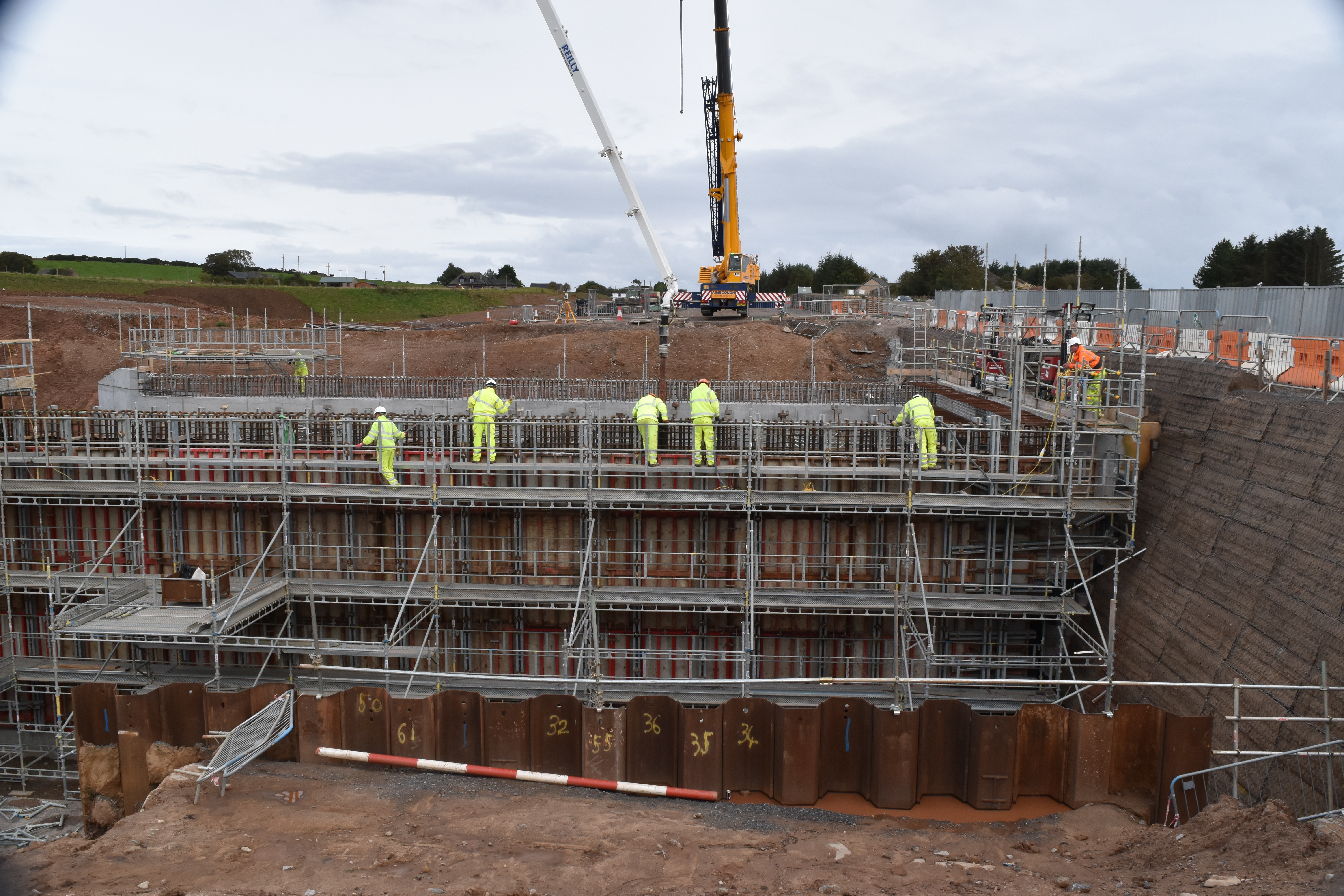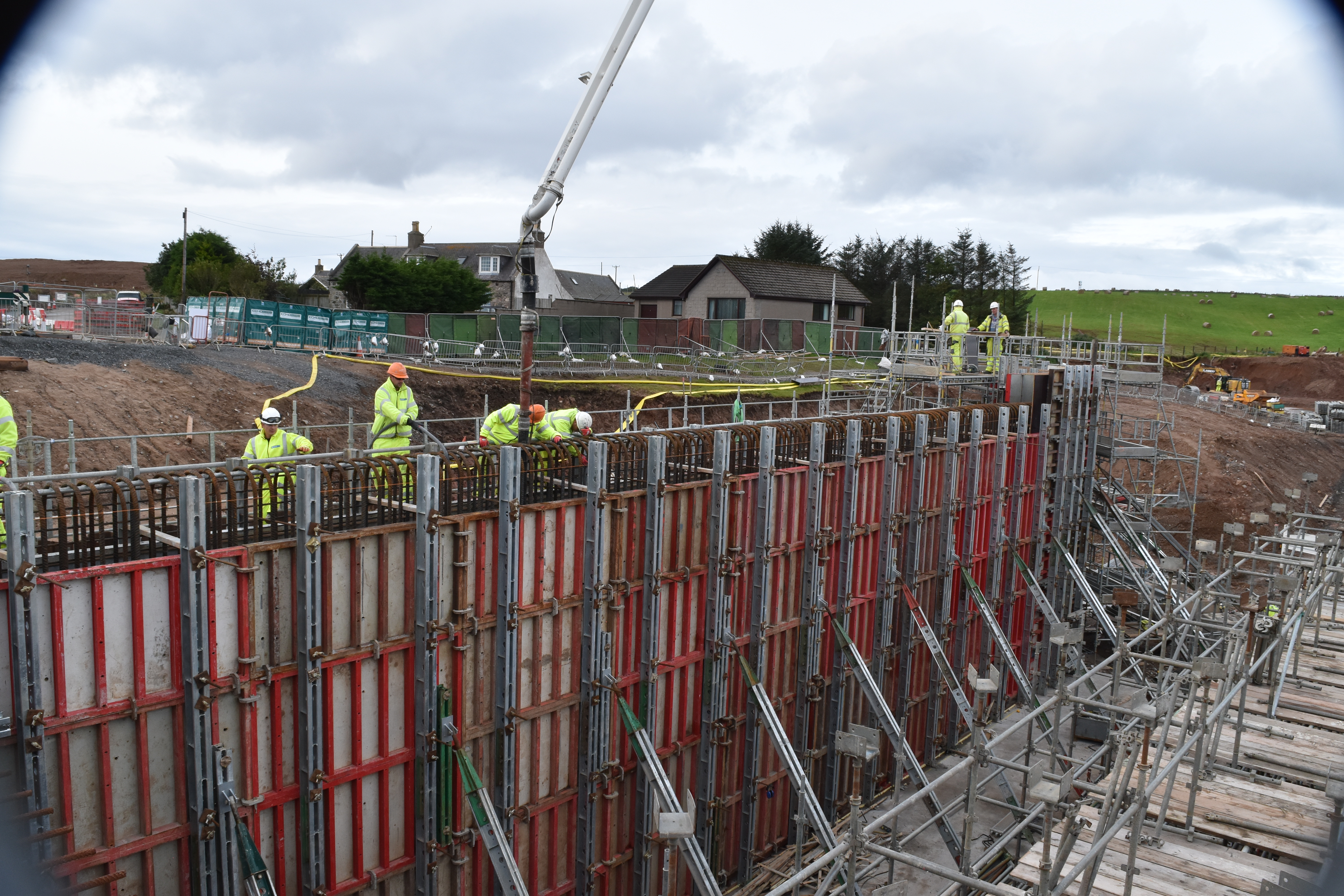 The major challenge was the concrete finish specified by both the client and Transport Scotland, along with funding partners Aberdeen City Council and Aberdeenshire Council. The finish specified on all primary structures was full plywood sheeting, bound by a horizontal and vertical recess with four tie holes through the sheet, one in each corner. Several attempts had already been made to develop a design before Leada Acrow’s Chief Technical Engineer devised a solution which was suitable. The finish was developed over a period to allow formwork panels to be set out accordingly, with Leada Acrow’s equipment being easily able to accommodate amended sizes.